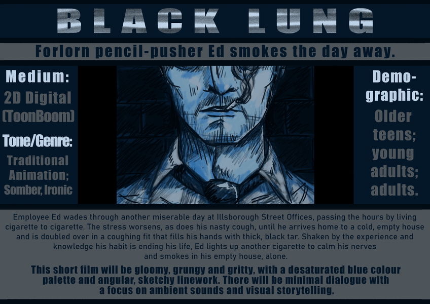 This is the animatic for the short film concept I created at the end of my 1st year at UWE, "Black Lung". It tells the story of a chain smoker trying to get through another day at the office, judging time passing as breaks between cigarettes. Originally, it was intended to end on Ed getting home after a day of smoking and then coughing up his lungs, producing a thick, black liquid. It would then cut to him, visibly shaken, lighting up another cigarette to calm his nerves. My aim with this short film was to comment on the irony of vices, and how you turn to them for comfort even though they are what's hurting you.